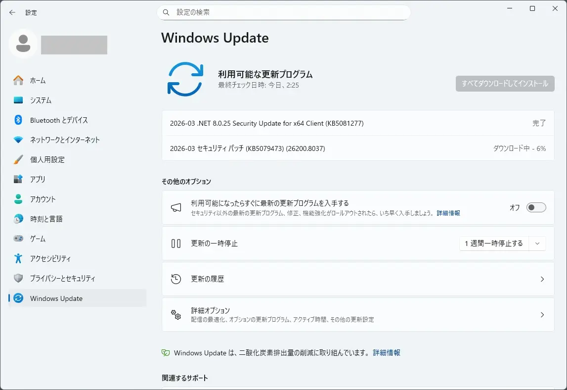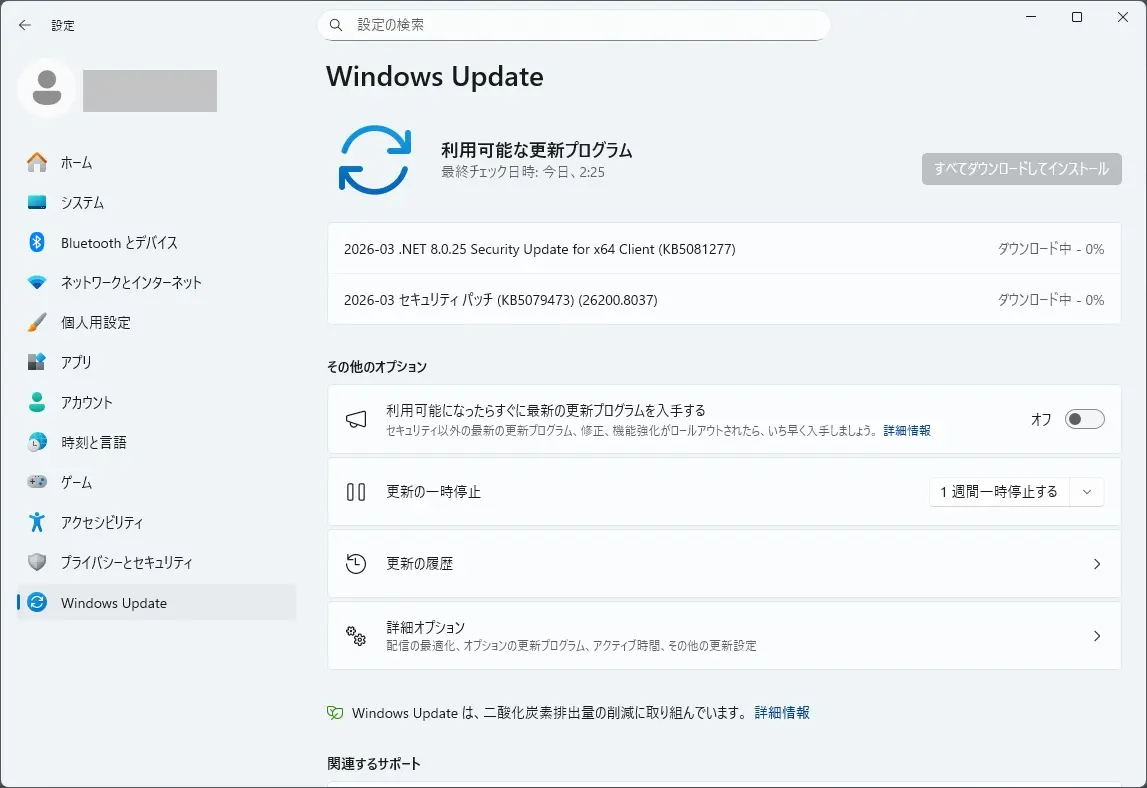 本日は、2026-03 .NET 8.0.25 Security Update for x64 Client (KB5081277) も自動適用されました(再起動せず適用されました)。