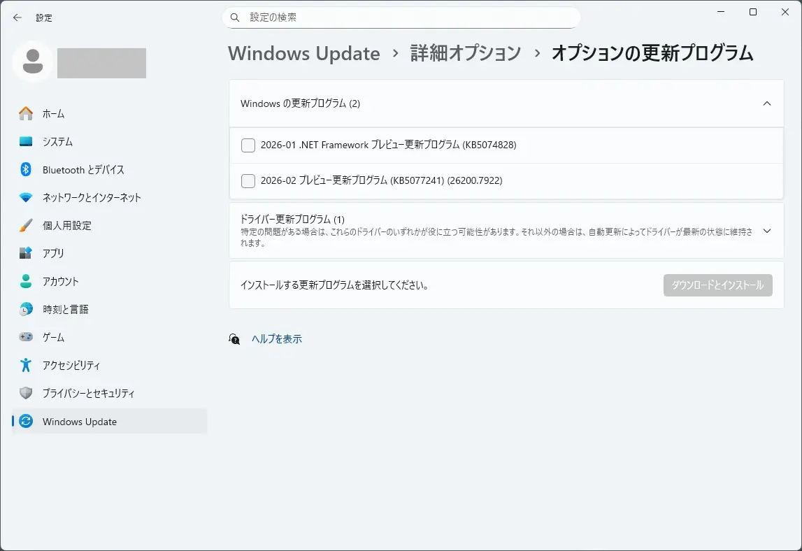 2026-02 プレビュー更新プログラム (KB5077241) (26200.7922) も表示されていました。