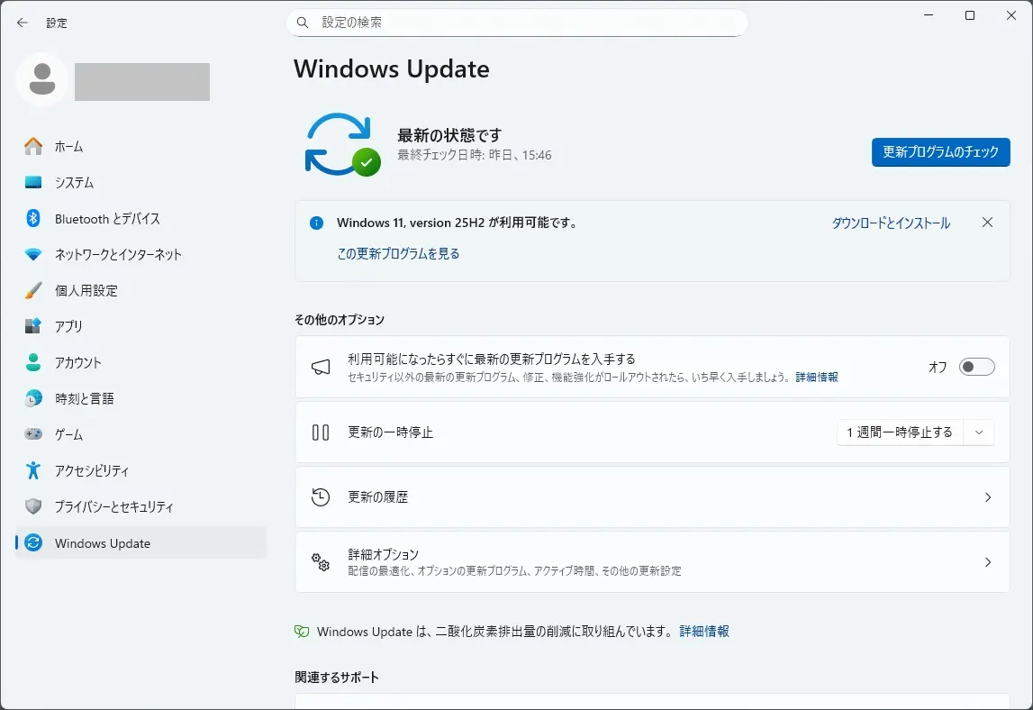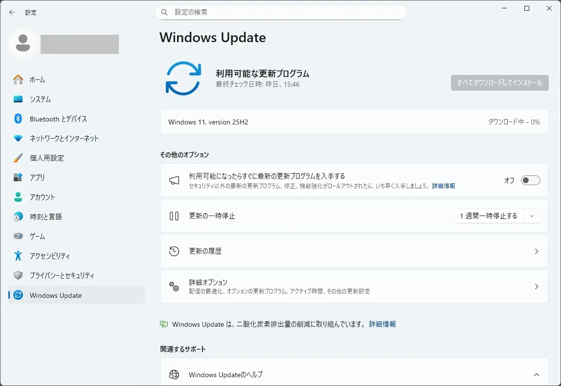 Windows Update に、最新版のWindows11 version 25H2 が表示されました。