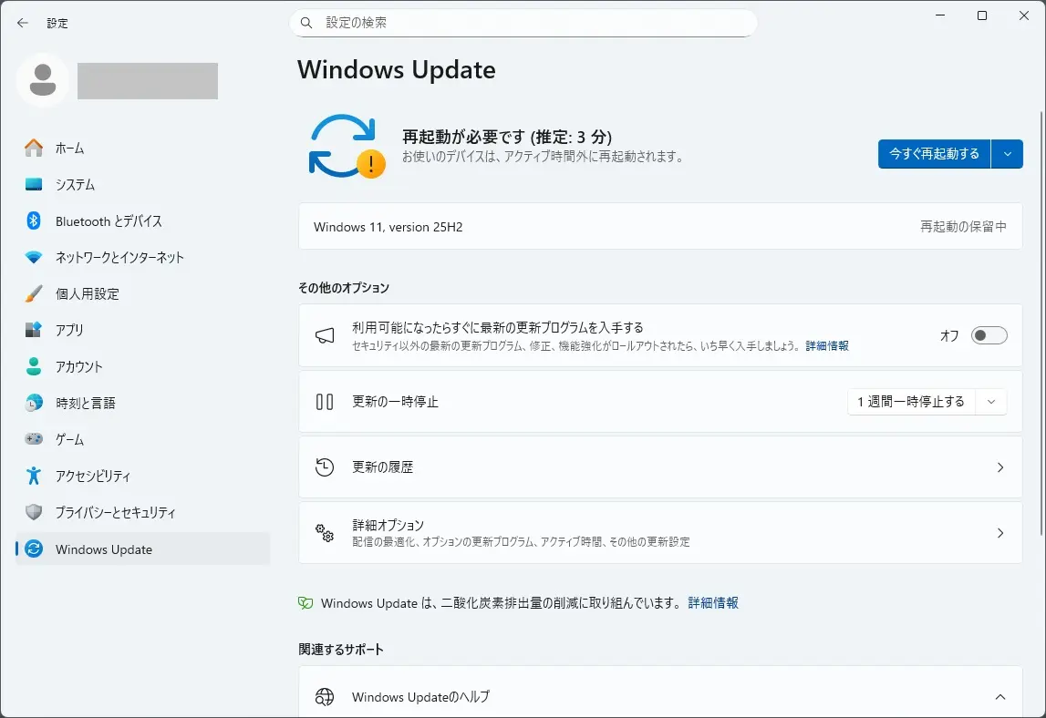 Windows11 25H2がWindows Update に表示されましたので、ダウンロード・インストールを行いました。